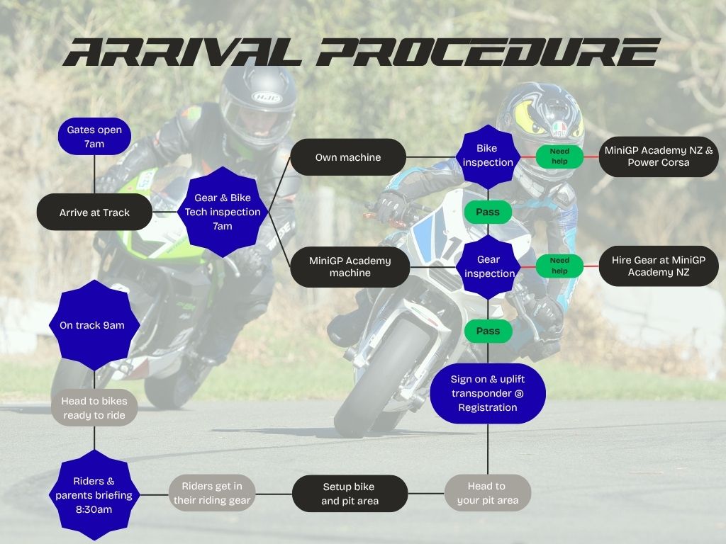 Riders who do not hold an MNZ Competition License, or who cannot provide proof of MiniGP Academy NZ race assessment competency, are required to complete a competency assessment at an official MiniGP practice day before being permitted to enter competition classes.